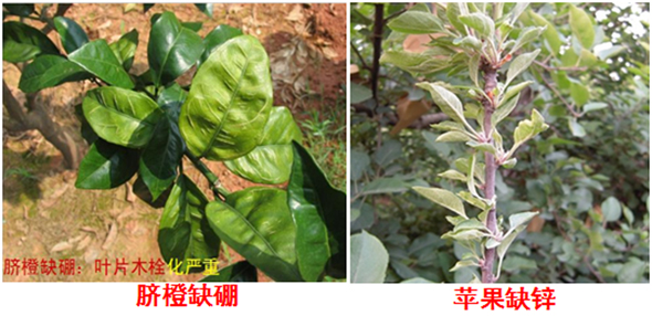纵观全国,在北方果园中,苹果、梨和桃树常出现缺铁的黄叶病、缺锌的小叶病和缺硼的腐心病,在南方果园里,柑橘、荔枝因缺硼或缺锌所引发的落果和新梢黄化症等近年来也常常出现(如下图)。
